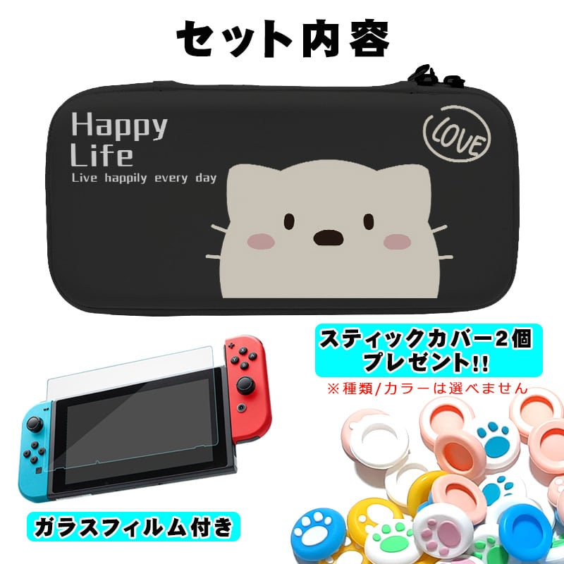 Nintendo Switch キャリングケース アニマル ブラック ガラスフイルム スティクカバーセット 保護ケース 持ち運び キャリーバッグ ゲームカード 収納