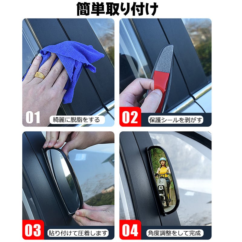 左右のサイドミラーの下部に取り付けるだけで、後方、斜め、下方までしっかりと確認