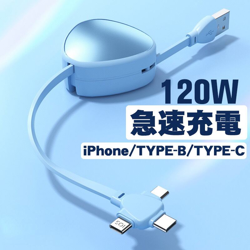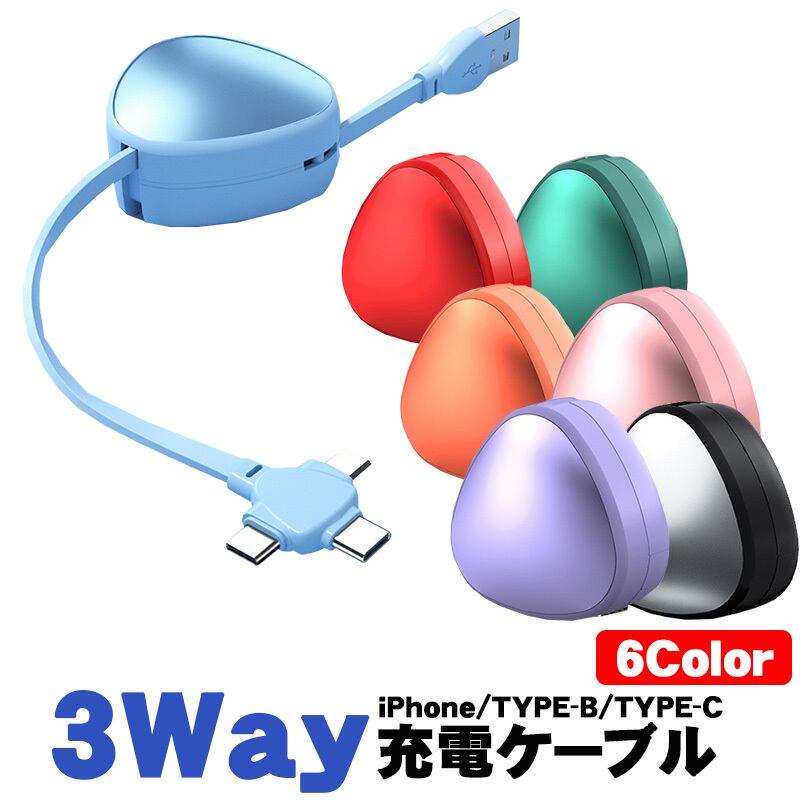 商品名:充電ケーブル 三角 3way 急速充電 巻き取り TYPE-B TYPE-C iPhone用 1本3役 スタンド機能付き 7カラー