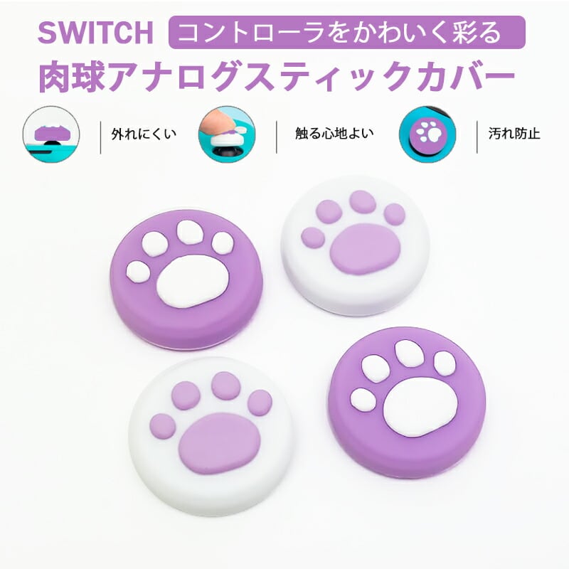 Nintendo Switch/Switch Lite対応 アナログスティックカバー 肉球 任天堂スイッチ ライト ニンテンドー 猫 ジョイスティックカバー パープル ホワイト 全2色 各色2個 4個セット 【送料無料】